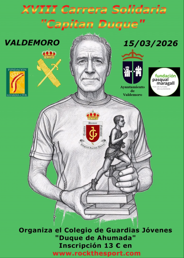 El Colegio de Guardias Jóvenes Duque de Ahumada organiza el domingo 15 de marzo la XVIII Carrera Solidaria Capitán Duque, en la que podrán participar atletas a partir de 18 años. Las inscripciones (13 €) se pueden realizar hasta el 10 de marzo (o hasta completar 1.500 dorsales) en www.rockthesport.com y la recaudación irá destinada a colaborar con la Fundación Pasqual Maragall, que lucha por un futuro sin alzhéimer.