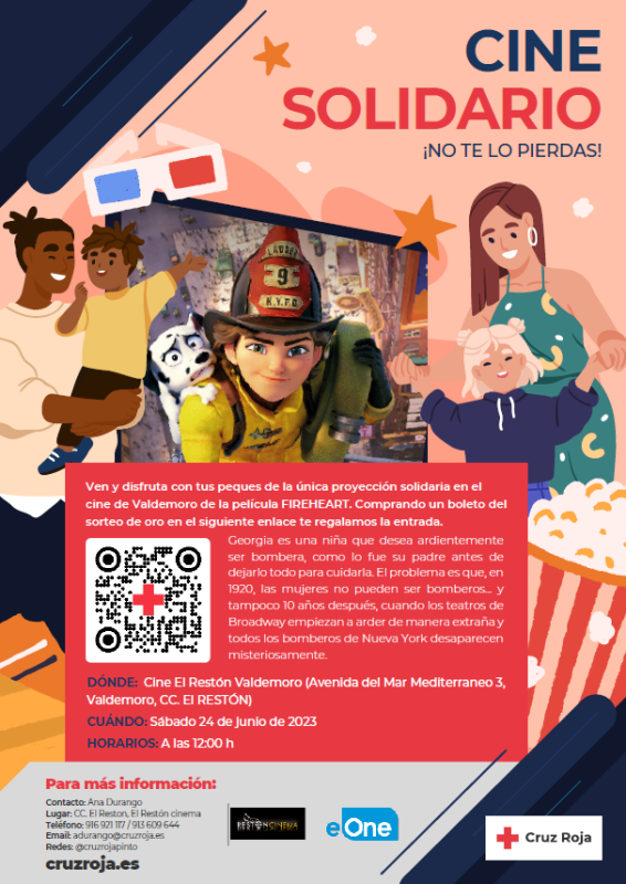 El sábado 24 de junio a las 12.00 h., Cruz Roja ha programado una sesión de cine solidario con la proyección de Fireheart, una película para disfrutar en familia en las salas Restón Cinema. Las entradas se pueden adquirir a través de un enlace, cuestan 5€ y en el precio está incluido un boleto que se entregará a los espectadores a la entrada del cine para el sorteo de oro de Cruz Roja que se celebrará el 25 de julio.