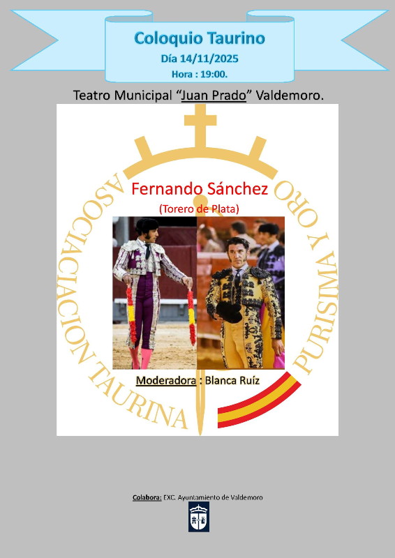 El Teatro Municipal Juan Prado (C/ Estrella de Elola, 27) acoge el 14 de noviembre, a las 19:00 h, el coloquio taurino organizado por la asociación taurina Purísima y Oro. Contará con la presencia de Fernando Sánchez (torero de plata) y con Blanca Ruiz en el papel de moderadora.