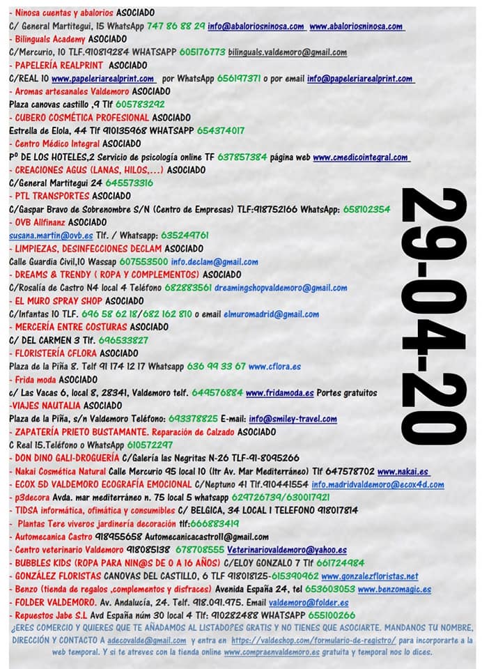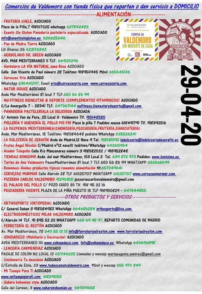 Adecovalde, Asociación del comercio de Valdemoro ha elaborado una relación de comercios locales con tienda física que reparten o dan servicio a domicilio durante el tiempo que dure el confinamiento para evitar la propagación de COVID-19.