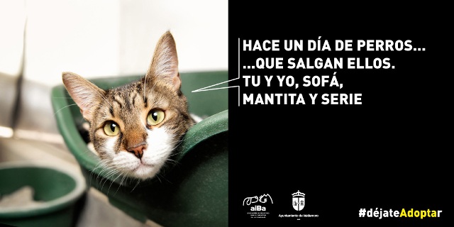 En Valdemoro, la media anual de animales de los que sus dueños se desentienden supera el centenar, de los que el 65% son perros y el 35% restante, gatos. Con el fin de combatir los efectos de este acto irresponsable, el Ayuntamiento ha puesto en marcha una campaña de concienciación para potenciar la adopción de las mascotas del municipio sin hogar. Esta acción comunicativa -que no ha tenido coste ya que ha sido desarrollada por personal municipal- se caracteriza por los curiosos mensajes que los perros y gatos que la protagonizan dirigen a sus potenciales dueños, como si fueran estos quienes necesitan ser acogidos y cuidados por los animales («Tienes el azúcar un poco alto. Te voy a tener que sacar a pasear». «Lo percibo… necesitas que alguien te haga compañía y soporte tus neuras»).