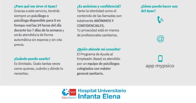 Para continuar ayudando a minimizar los posibles daños provocados por alteraciones psicológicas (las más comunes son ansiedad, tendencia depresiva, altos niveles de estrés, insomnio, pesadillas o labilidad emocional -cambios bruscos en los estados de ánimo-…), el servicio de  planificó dar una mayor cobertura a todos los profesionales en el plan de medidas psicosociales con un Plan de ayuda al empleado. La elaboración, preparación y puesta en marcha del citado plan ha contado con la colaboración de la compañía AFFOR Prevención Psicosocial, empresa experta en riesgos psicosociales y especializada en proyectos como el Programa de Ayuda al Empleado, un servicio de atención psicológica al que pueden acudir los trabajadores de estos hospitales para resolver cualquier posible malestar psicológico y emocional, tanto en el ámbito personal como laboral.