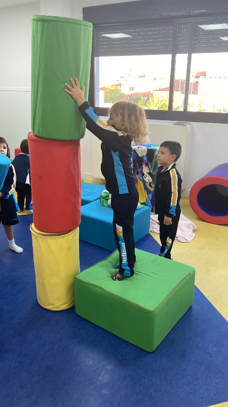 En las sesiones educativas, dirigidas a pequeños grupos, la sala se convierte en un escenario de libertad y respeto. Allí los niños pueden correr, saltar, derribar, esconderse, construir o representar… todo aquello que su cuerpo necesita expresar. No se trata de una actividad deportiva ni de un juego libre sin dirección, sino de un dispositivo cuidadosamente estructurado, con rituales, tiempos y espacios definidos que ofrecen seguridad y continuidad. Cada sesión comienza con un ritual de entrada, un momento donde el grupo se reencuentra, se organiza y anticipa el juego. A partir de ahí, el cuerpo toma la palabra. En ese movimiento se despliegan emociones profundas: la alegría de saltar, la fuerza de empujar, la risa compartida, el miedo a caer o la necesidad de esconderse. Todo tiene sentido. Todo forma parte del proceso de maduración. A través del movimiento y del placer de actuar, el niño va integrando su esquema corporal, construyendo su pensamiento, afianzando su autonomía y aprendiendo a convivir. Poco a poco, el juego sensorio motor da paso al juego simbólico: los módulos se transforman en barcos, castillos o casas. El niño pasa de actuar con el cuerpo a pensar con imágenes, abriendo la puerta al lenguaje y el pensamiento abstracto.