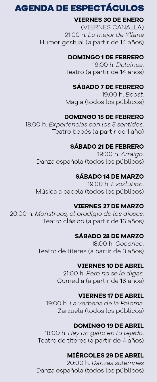El 7 de febrero, llega Boost, un espectáculo de magia para todos los públicos en el que la participación del público es protagonista, mientras que el 15 de febrero, la primera infancia será la protagonista con Experiencia con los cinco sentidos, un viaje sensorial que estimula ver, oír, tocar, oler y saborear, fomentando la curiosidad y el juego creativo. El 21 de febrero, la danza española toma el escenario con Arraigo, un montaje que recorre las raíces culturales de la península ibérica a través del folclore y la danza estilizada.
