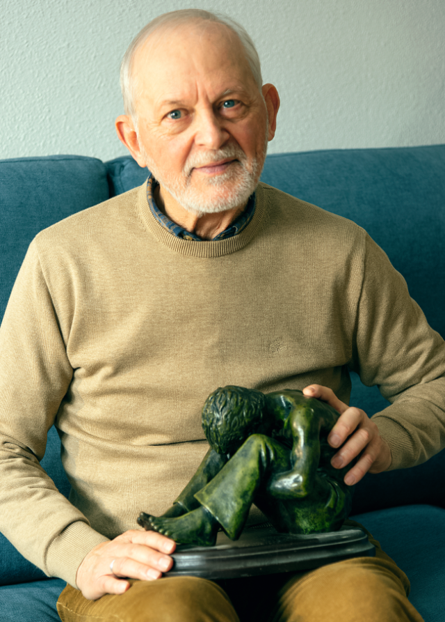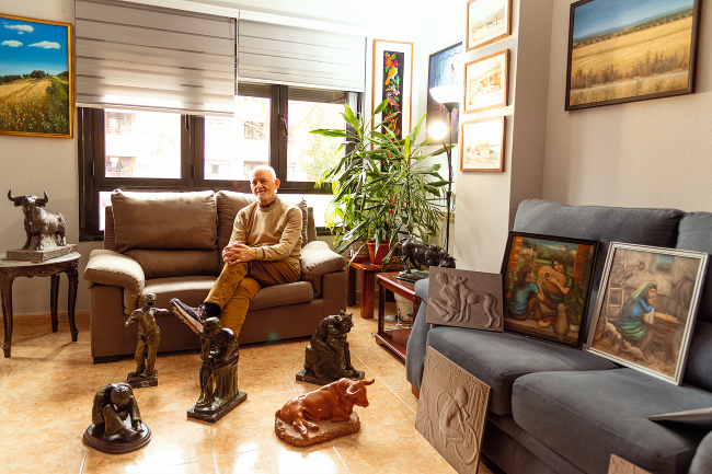 Un día, mi amigo José Luis Rodríguez Leal, el fotógrafo del pueblo, me invitó a comer en el Centro de Mayores y me presentó a la directora, Felipa Gómez. Me propuso que enseñara inglés como voluntario. Allí llevo desde 2018. Hasta que llegó el coronavirus, comía en la cafetería del centro y así hice muchos amigos. Fueron momentos muy gratos. Ese mismo año, Felipa me invitó a exponer mi trabajo en el centro y para mí fue un honor. Recopilé mis mejores pinturas y esculturas para llevar a cabo mi primera exposición en muchos años. No me podía creer todas las cosas buenas que me estaban pasando. Agradezco mucho a Felipa y a Juan Antonio, su marido, todo su apoyo. Un día afortunado me presentaron a mi actual mujer, Janet. Ambos sentimos una atracción muy profunda y comenzamos a pasar más tiempo juntos. Descubrimos que compartíamos un interés especial por el arte, la naturaleza y los viajes. Janet me ayudó a entender y a navegar por un mundo desconocido para mí. Apareció en el momento más oportuno. Como madre que ha criado a dos hijos, Janet me ha enseñado el significado del amor incondicional y el valor de los vínculos familiares, que yo no había experimentado antes. Comenzamos a viajar a lugares históricos y me impulsó a contactar nuevamente con mis hermanos y mi familia en Estados Unidos, con quienes había perdido casi toda comunicación. Sin su compañía, no habría imaginado las experiencias que hemos compartido estos últimos siete años. No he conocido a nadie con tanta vitalidad y ganas de vivir, con lo que fue fácil decidirme a casarme y vivir con ella. Cuida de mí constantemente. Parte de esos cuidados son sus deliciosos platos colombianos, típicos de su país de origen.