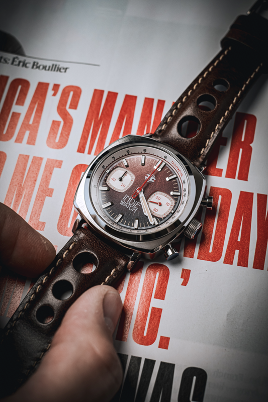 Inspirado en los cronógrafos clásicos de los años 60 y 70, Strum rinde homenaje a la época dorada del motor. Nos gusta pensar en él como un guiño al pasado, reinterpretado con una mirada contemporánea. Sus líneas limpias, caja compacta y movimiento Miyota 6S21 reflejan nuestra pasión por la precisión y el diseño funcional.