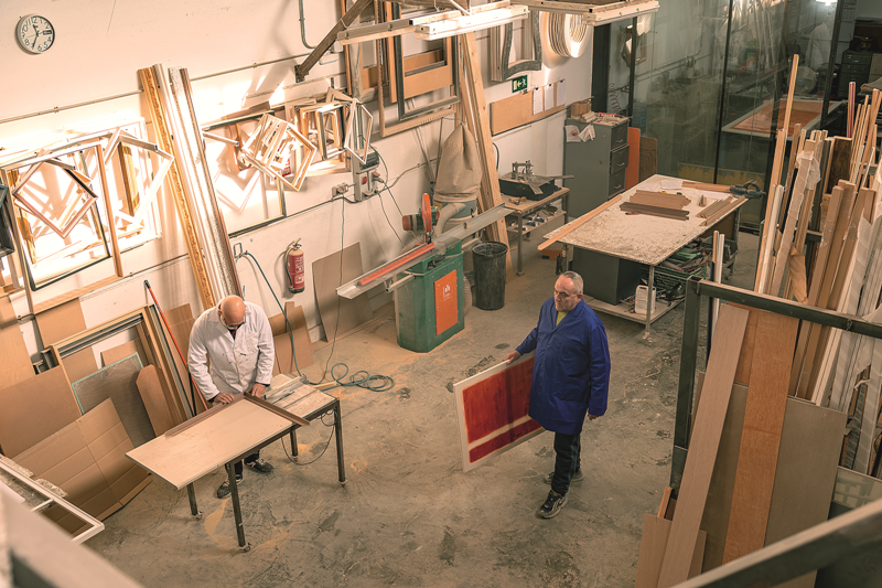Podríamos decir que ha sido una trayectoria circular. Joaquín empezó este negocio haciendo pura artesanía y trabajos más delicados. La empresa fue creciendo y aumentando el volumen de trabajo. El pico más alto de trabajo coincide con nuestra llegada a Valdemoro. En esa época integramos en nuestra empresa la producción de bajo coste para otras fábricas. Teníamos más de treinta y cinco empleados, cuatro naves y un volumen de trabajo muy alto. Con la crisis de 2008 tuvimos que redimensionar el negocio y volver a lo que sabíamos hacer, el trabajo artesanal personalizado.