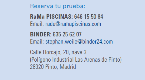 RAMA Piscinas, empresa especializada en la construcción y rehabilitación de piscinas en la Comunidad de Madrid, junto con el fabricante alemán Binder GmbH & Co. KG, inauguró el pasado 13 de junio el primer Binder Test Center de la península ibérica. Este centro de pruebas exclusivo, ubicado en el Polígono Industrial Las Arenas, de Pinto (calle Horcajo, 20, nave 3), ofrece a los usuarios la oportunidad de experimentar de primera mano las últimas innovaciones en tecnología de natación con turbina contracorriente.
