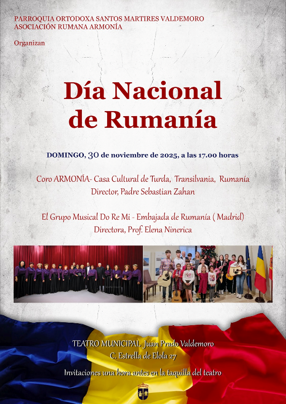 El Teatro Municipal Juan Prado acoge el 30 de noviembre (17:00 h) la celebración del Día Nacional de Rumanía, que un año más organiza la Parroquia Ortodoxa Rumana de Valdemoro, con un acto en el que actuará el coro Armonía, procedente de aquel país, y que este año celebra su 20.º aniversario.