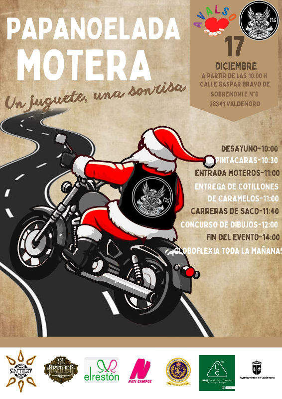 La Asociación Valdemoro Solidario (Avalso), en colaboración con el motogrup Northmen MG, celebra el domingo 17 de diciembre su segunda ´Papanoelada Motera’, una fiesta en la que un numeroso grupo de aficionados a las dos ruedas ataviados de Papa Noel entregarán juguetes a los peques previamente invitados por el colectivo.