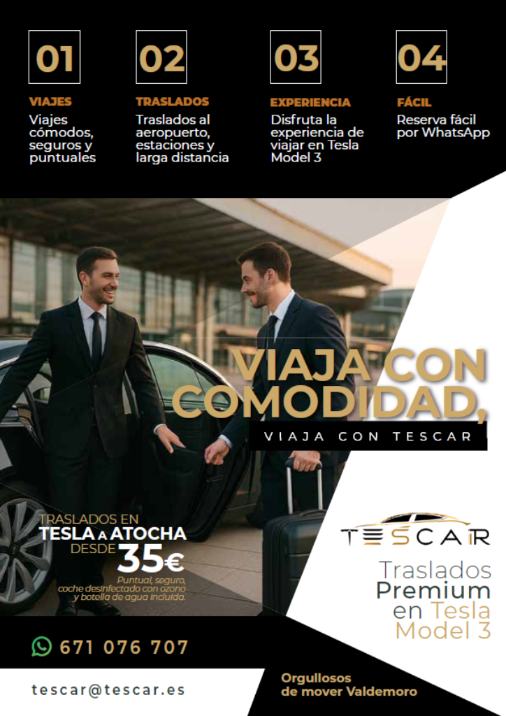 Tescar nació en 2023, aquí en Valdemoro, con una idea muy clara: ofrecer traslados premium a precios competitivos. Queríamos demostrar que se puede dar un servicio de primer nivel sin necesidad de pagar tarifas abusivas, y hacerlo además apostando por la sostenibilidad con vehículos 100 % eléctricos Tesla.