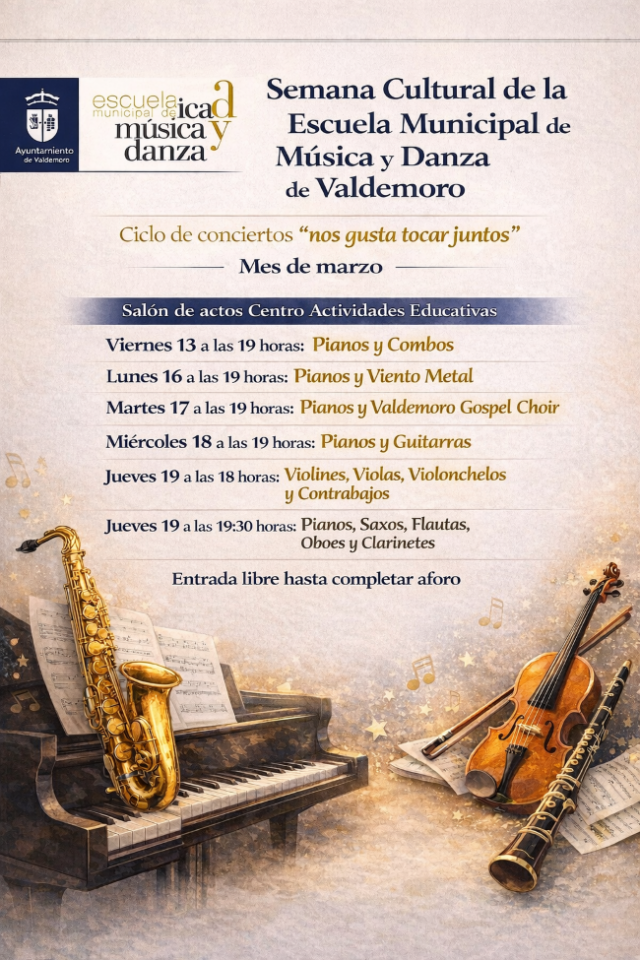 La Escuela Municipal de Música y Danza de Valdemoro celebra durante el mes de marzo su Semana Cultural, con un ciclo de conciertos titulado Nos gusta tocar juntos, que tendrá lugar en el salón de actos del Centro de Actividades Educativas. La programación propone encuentros musicales entre el piano y diferentes especialidades instrumentales y vocales, con entrada libre hasta completar aforo.