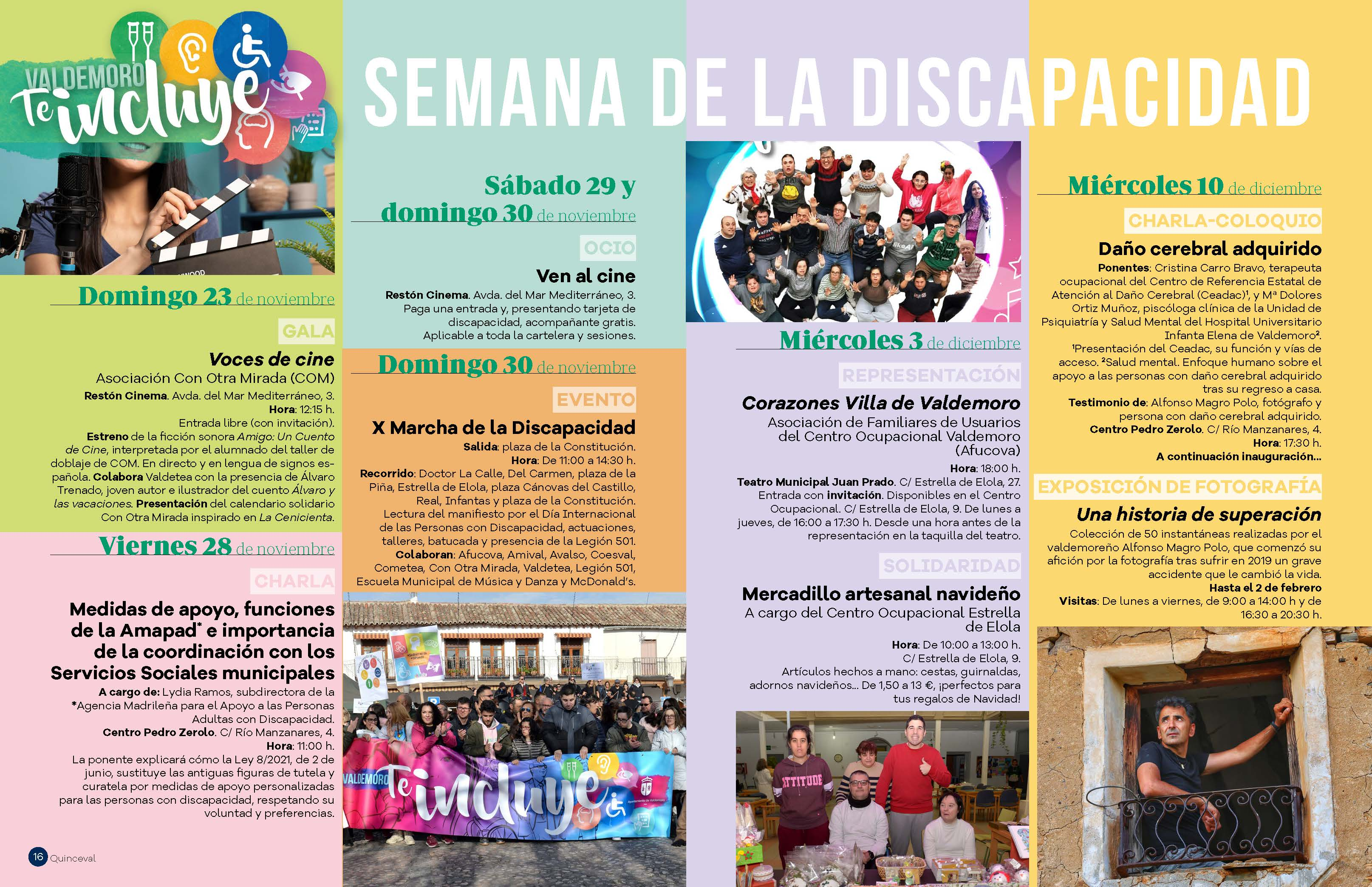 El 23 de noviembre arranca el programa de actividades de la Semana de la Discapacidad organizado por el Ayuntamiento de Valdemoro y asociaciones locales de este ámbito en torno al Día Internacional de las Personas con Discapacidad, que se conmemora cada 3 de diciembre. El domingo 30 noviembre se celebrará el acto central de estas jornadas que llevan por lema ‘Valdemoro te incluye’: la marcha lúdica y reivindicativa que partirá de la plaza de la Constitución. Además habrá charlas-coloquio, cine con descuentos, festival, mercadillo artesanal y una exposición de fotografía.