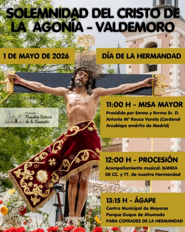 Valdemoro se prepara para vivir una de sus citas religiosas más destacadas con la celebración de la Solemnidad del Cristo de la Agonía, que tendrá lugar el próximo 1 de mayo de 2026. La jornada, organizada por la Hermandad, reunirá a fieles y vecinos en un día marcado por la devoción, la tradición y la convivencia.
