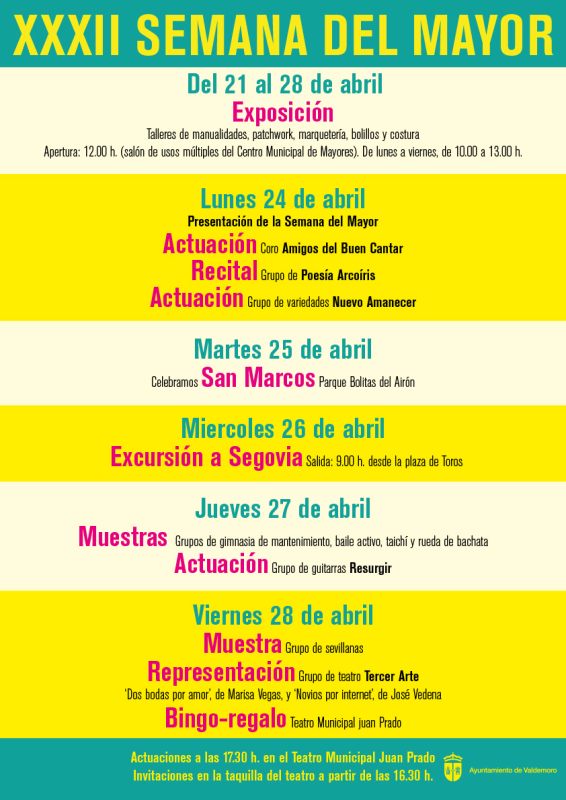 • Lunes 24 de abril. 17.30 h. Presentación de la XXXII Semana del Mayor. Actuaciones del coro Amigos del Buen Cantar, del grupo de poesía Arcoíris y de la compañía de variedades Nuevo Amanecer.